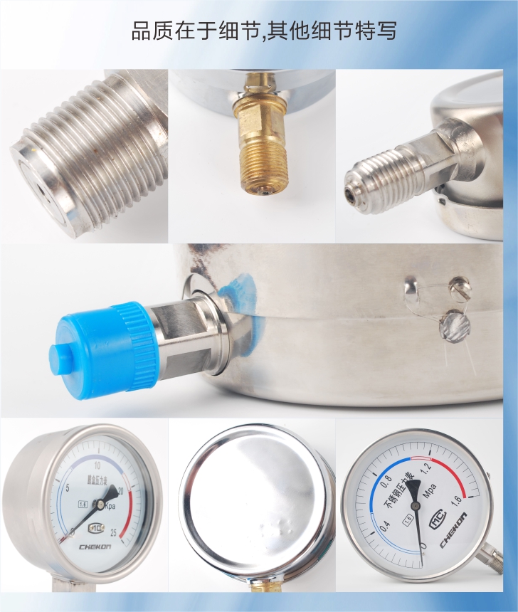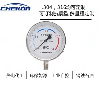 不銹鋼壓力表采用直接接觸式接頭和感壓元件材料,采用icr18Ni9T、Ocr18Ni12Mo2Ti、 sus316,結(jié)構(gòu)為全密封型,具有較強(qiáng)的防被測介質(zhì)腐蝕和抗環(huán)境腐蝕的能力。不銹鋼壓力表適用于腐蝕性較強(qiáng)的適合不銹鋼元件檢測的介質(zhì)和惡劣的外部腐蝕環(huán)境中 ,不銹鋼壓力表廣泛應(yīng)用于石油、化工、冶金等工業(yè)。