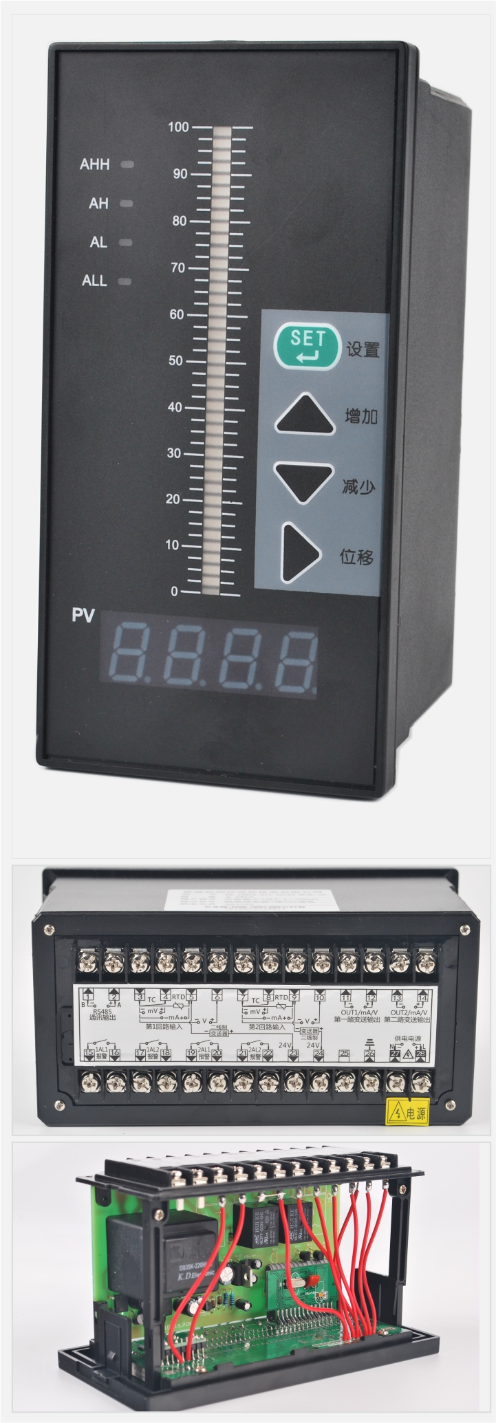 采用高亮度LED數(shù)碼顯示和高分辨率光柱顯示(比例顯示),使測量/控制值的顯示更為清晰直觀。